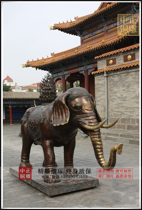 銅大象在印度、泰國稱為“象神”,大象的鼻子可吸水象征可把外面的財吸進來,銅大象擺放在公司門口或家里都有招財作用,其中背馱金蟾的大象謂之“向上發財”。因為萬象更新的“象”,諧音“祥”、和“相”,古人云:“太平有象”,寓意“吉祥如意”。