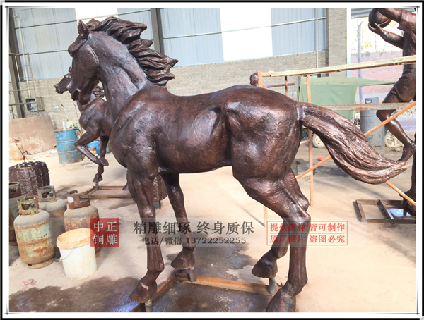 銅馬廠家雕刻出的馬,雄壯無比,力大無窮,追月逐日,披星跨斗,乘風御雨,不舍晝夜。這正是中華民族戰天斗地,征服自然的生動寫照,是炎黃子孫克服困難,永遠前進,是中國人民不畏艱險,樂觀向上的生命意義的反映。所以其一般擺放在企業門口既有拼搏向上的精神,也有招賢納才的寓意!